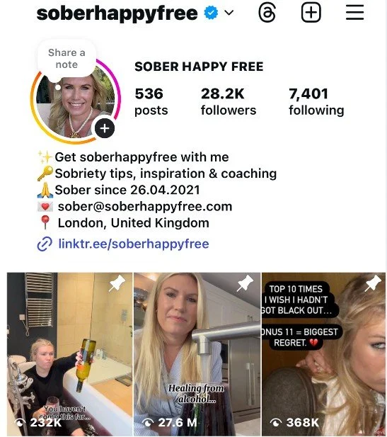 Sober Happy Free is more than a coaching space, it's a growing community of support and inspiration. Hattie shares her personal experiences, insights and tips on Instagram and TikTok. @soberhappyfree has received 48M+ views, 1M+ likes, and 37+ followers in just one year.